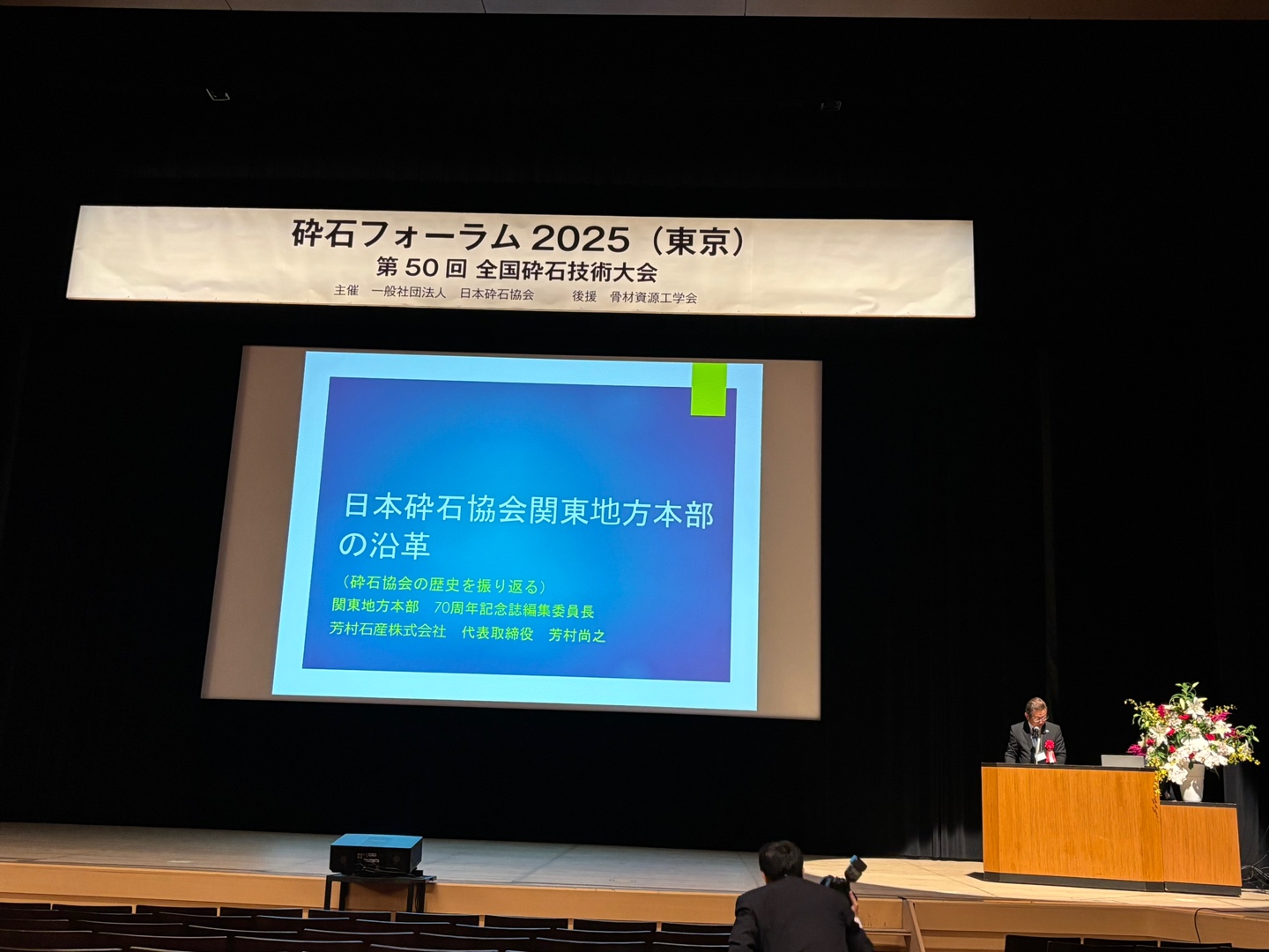(一社)日本砕石協会主催の第50回砕石フォーラムにて、弊社社長の芳村尚之が日本砕石業の誕生から日本砕石協会の成り立ちについて講演しました。